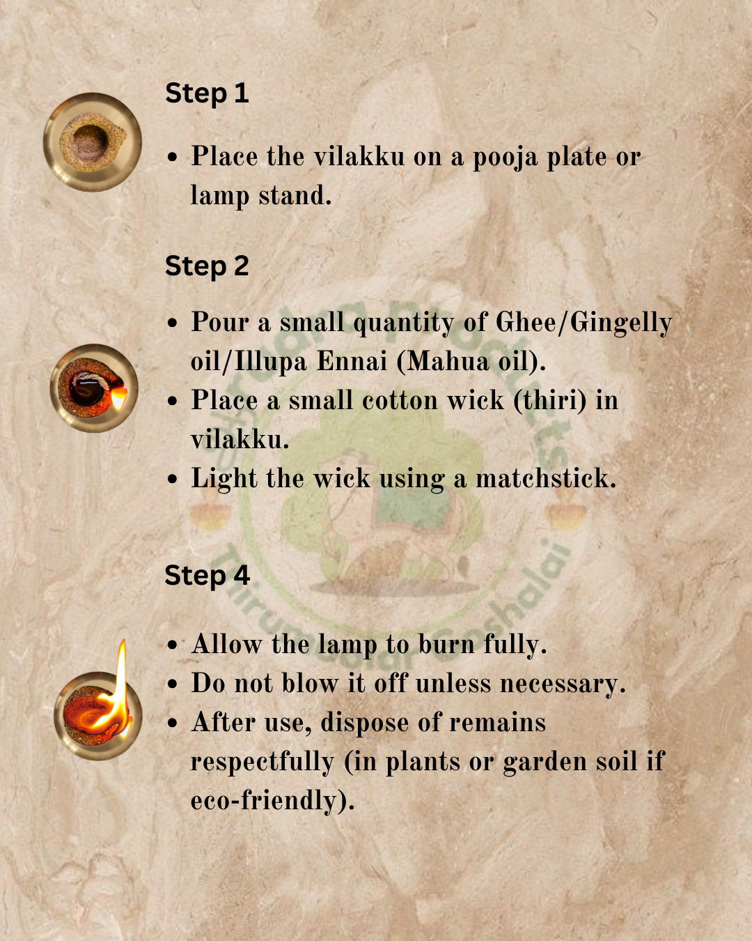 1. Place the Panchagavya Vilakku on a heat-safe plate or pooja holder.